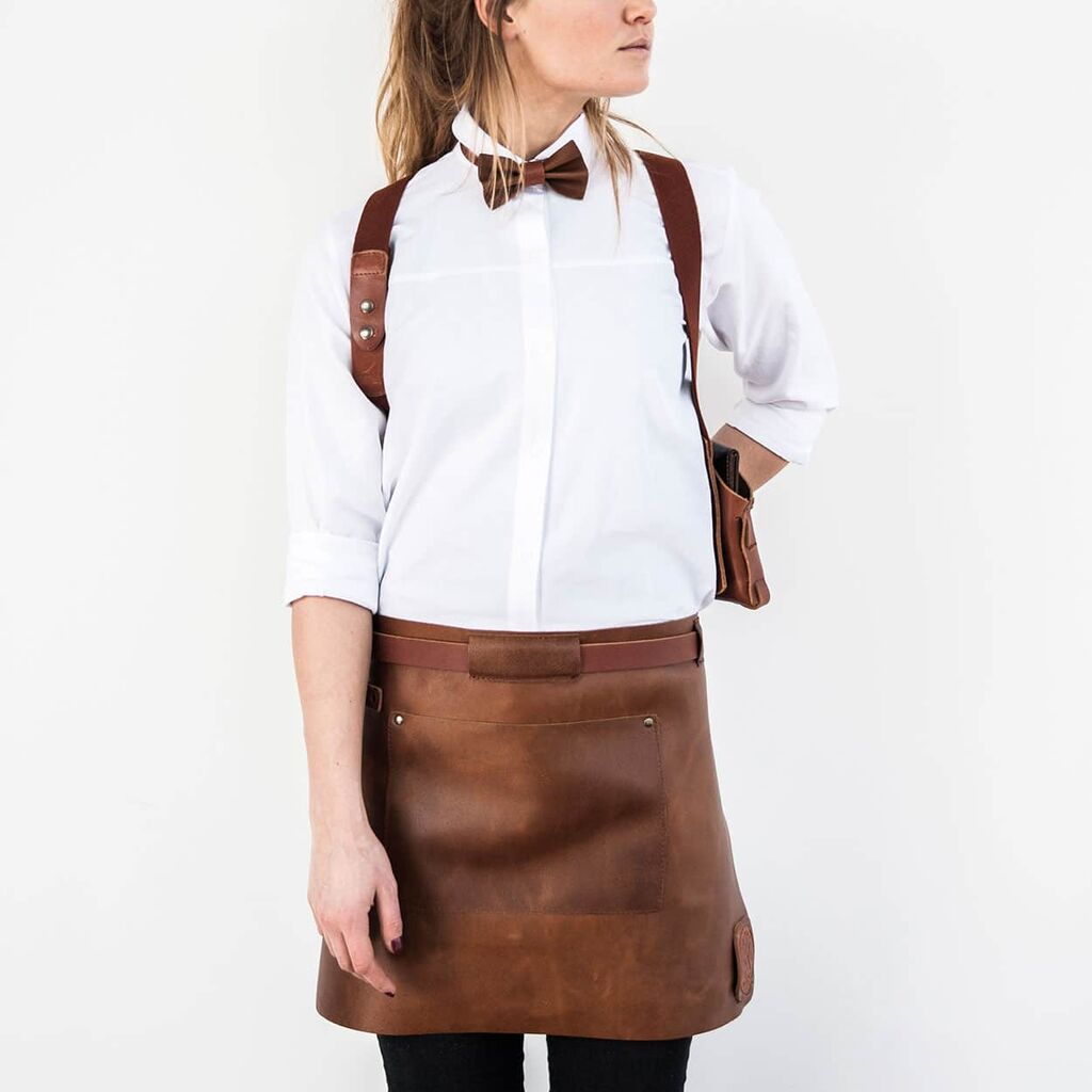Handcrafted mens short leather aprons, finished with leather details.Our four colored short aprons are very easy to use and ideal for the catering industry. The collection is handmade with great care, making each product very unique. We use soft and high quality grain leather, and as the leather lives and breathes these aprons get more beautiful over time while using it. The apron had a very handy tea towel loop to which a towel or one of our bags can be attached.