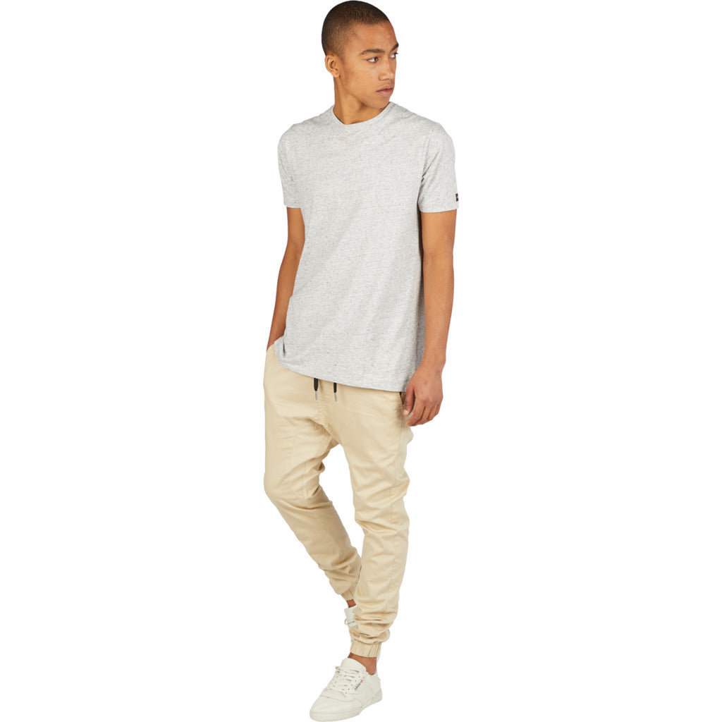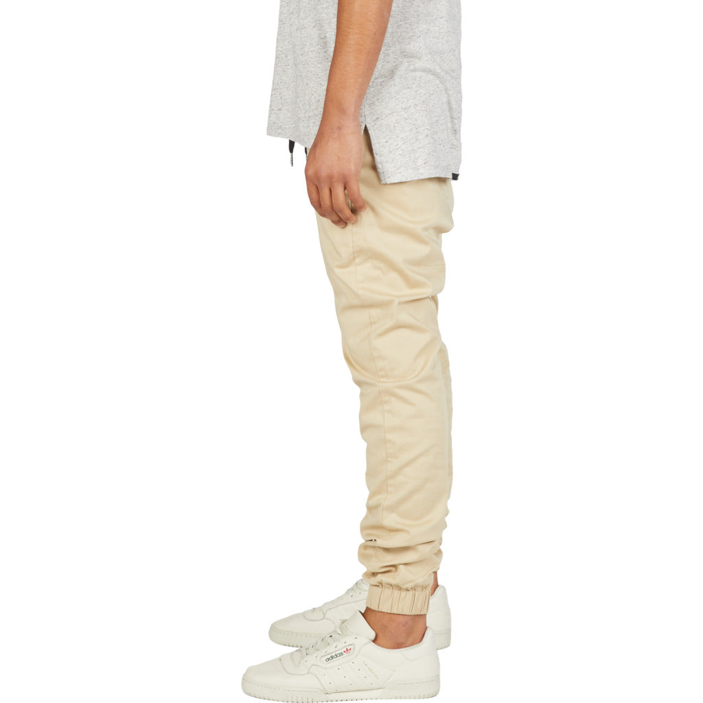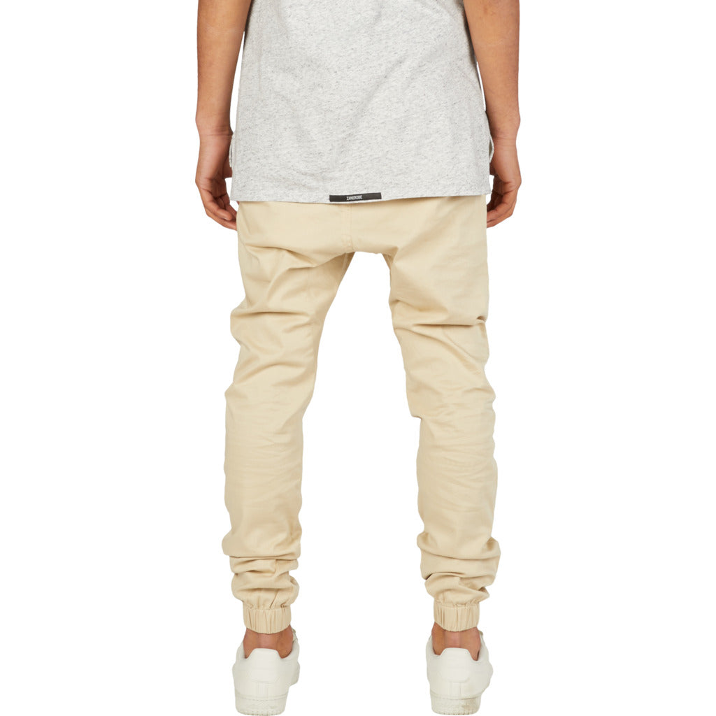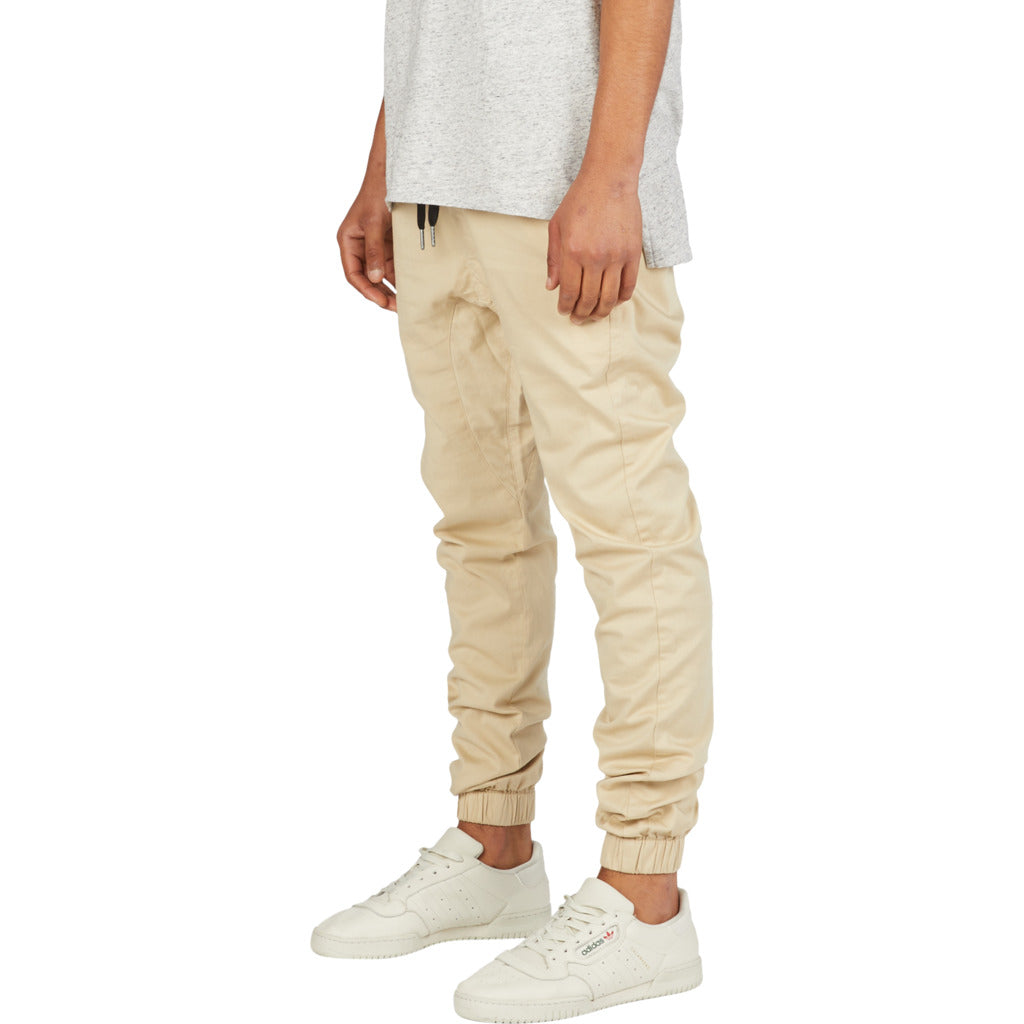 Zanerobe's signature lightweight cotton joggers have a drop-crotch fit, elasticized cuffs and drawstring waist. The Sureshot lightweight men's joggers in tan are perfect for everyday wear. These stylish pants are comfortable for all day wear. Made with paper-touch woven fabric with a garment dye wash. Hand-finished fabric and wash.