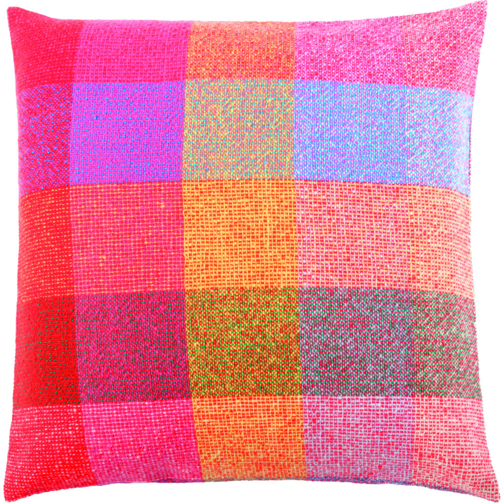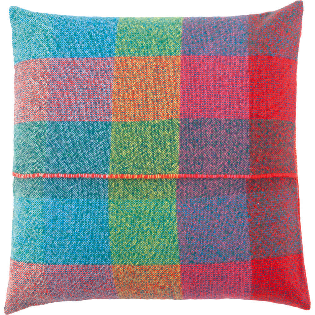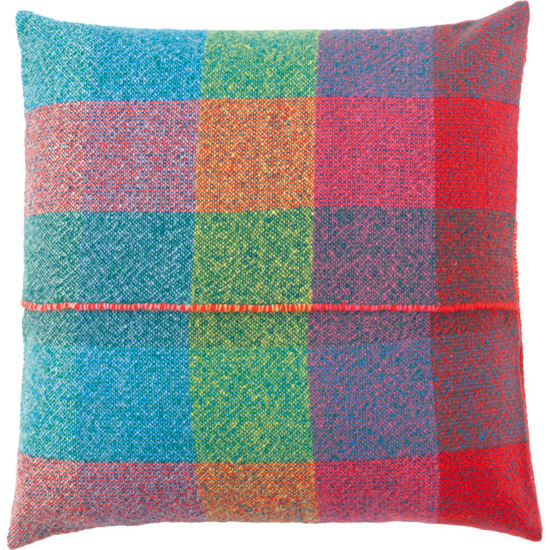 Just one part of Zuzunaga's Integrate: Time & Space Collection, the Squares Seat Cushion is handwoven using 100% merino wool. Zuzunaga's production process carefully traces the movement of their wool from farmer to cleaner, securing the utmost quality and high levels of sustainability. The rich raw materials that go into this cushion lead to a product with maximum warmth as well as the ability to naturally repel dirt and dust. Derived from the two core tenants of Zuzunaga design, color contrast and geometric forms, this throw pillow uses the overlapping nature of its weave to create a multitude of vibrant colors. In this way, the Squares Pillow represents interdependence and the power of connection.